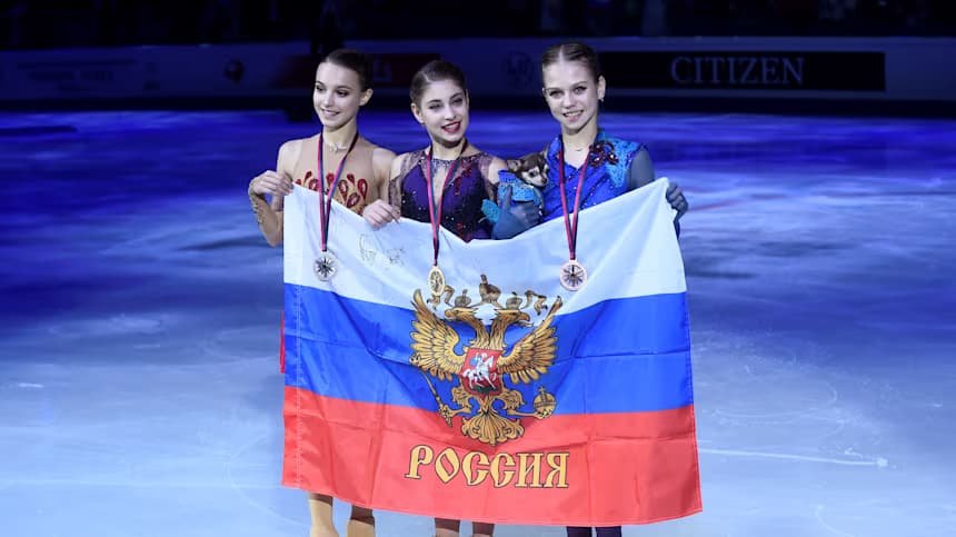 La imagen de las banderas, en el lado derecho muestra el mismo escenario de “podio completo” con las banderas de la Federación Rusa. Esta bandera fue adoptada el 11 de diciembre de 1993 luego de la disolución de la Unión Soviética. Entre las competencias con dominio de deportistas rusos figuran el campeonato mundial de atletismo del año 2013 en la disciplina marcha de 20 kilómetros, el campeonato europeo de patinaje artístico del año 2020 con la participación de Alena Kostornaia, medalla de oro, Anna Shcherbakova, medalla de plata y Alexandra Trusova, medalla de bronce.