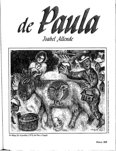 Mi segundo encuentro con el artista fue a través de Isabel Allende. En su novela de Paula, dedicada a su hija, la autora relata su admiración por el pintor al contrastar los tradicionales métodos que aplicaba su maestra de pintura en la escuela con la innovadora y disruptiva obra de Chagall. Cuenta además que dibujaba en un cuaderno formas extrañas inspirada en su admirado pintor mientras aguardaba largas horas en el hospital rogando por la recuperación de su hija.